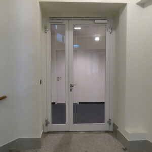 Im Nebeneingangsbereich wurden zwei neue wärmegedämmte Fluchttüren geliefert. Diese wurden den bestehenden denkmalgeschützten Türen angepasst, die vorhandenen Türgitter aufbereitet und für die neuen Portale übernommen. Die Türflügel wurden mit einem automatischen Antrieb ausgestattet, welcher im Brandfall die Türen zur Rauchentlüftung offen hält.