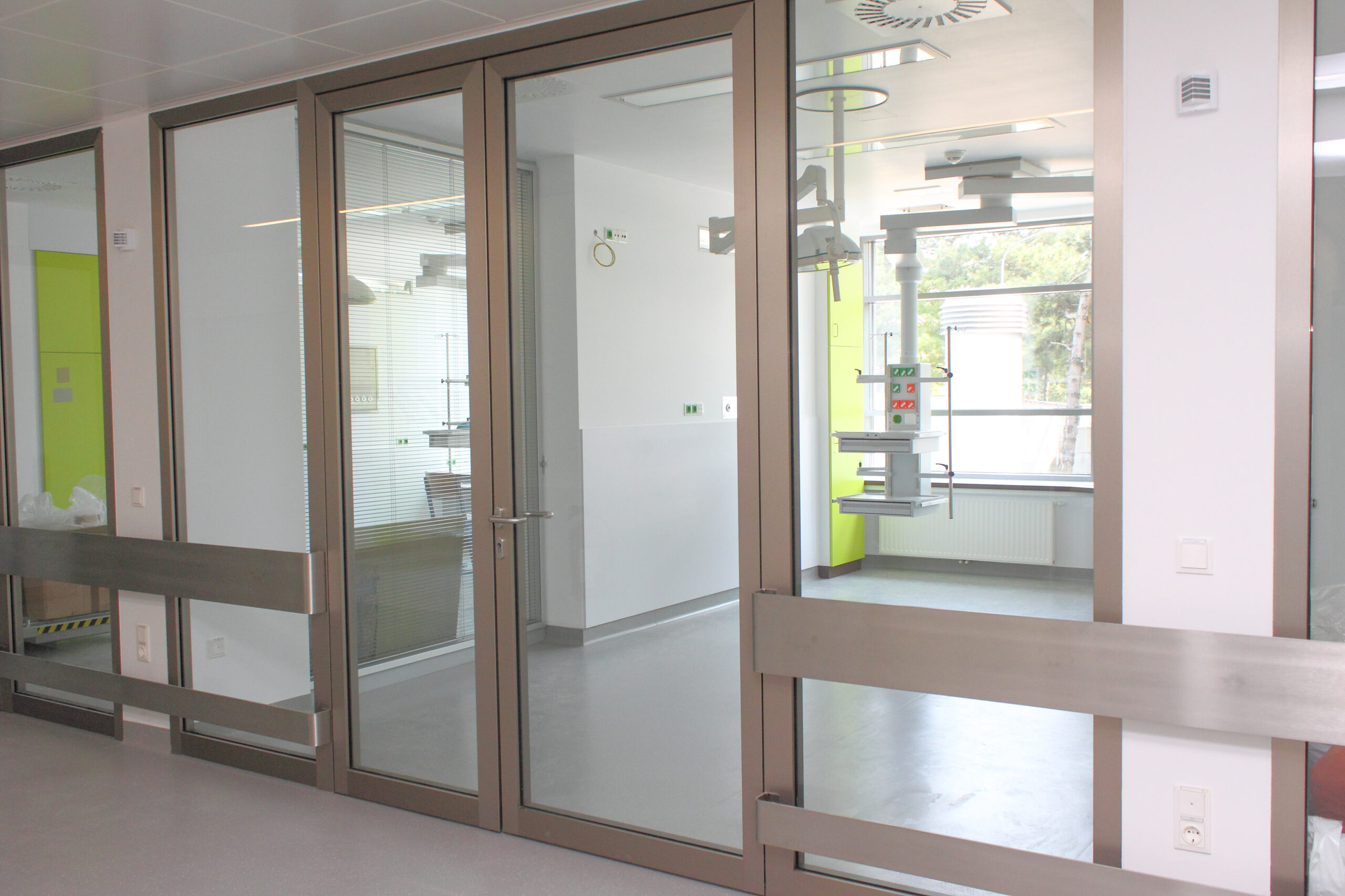 Im Zuge der Stationssanierung lieferten wir für die Kardiologische Intensivstation (ICU) sämtliche E30-Rauchschutzkonstruktionen in die Intensivkojen und eine Röntgenschutzverglasung mit Bleigleichwert 2,5 mm. Die Oberfläche der Portale wurden edelstahlähnlich geschliffen und eloxiert. Zusätzlich haben wir die Konstruktionen mit einem Edelstahl-Bettenanfahrschutz sowie Jalousien auf Türflügel und Seitenteil ausgestattet.